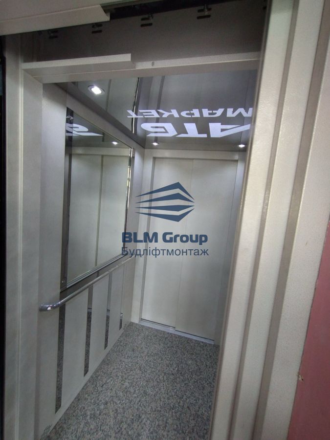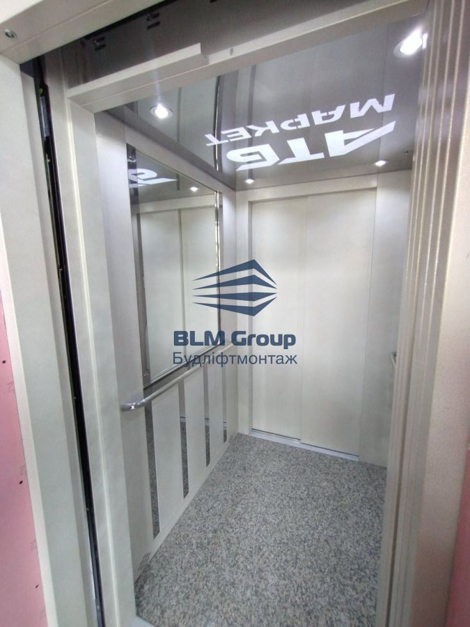 2024 рік. Місто Рівне, супермаркет АТБ. Поставка та монтаж ліфта 630 кг без машинного приміщення, прохідний на 2 зупинки. Оздоблення кабіни - фарбований метал зі вставками з нержавіючої сталі. На підлозі природній камінь, що забезпечує довговічність та зносостійкий. Термін виготовлення 4 тижні, монтаж - 8 днів. Ліфти оснащенні системою аварійної евакуації, при вимкненні світла ліфт доїжджає до найближчого поверху та відчиняє двері.