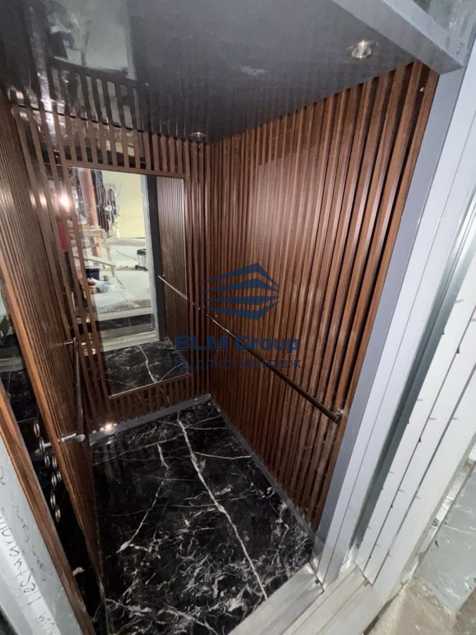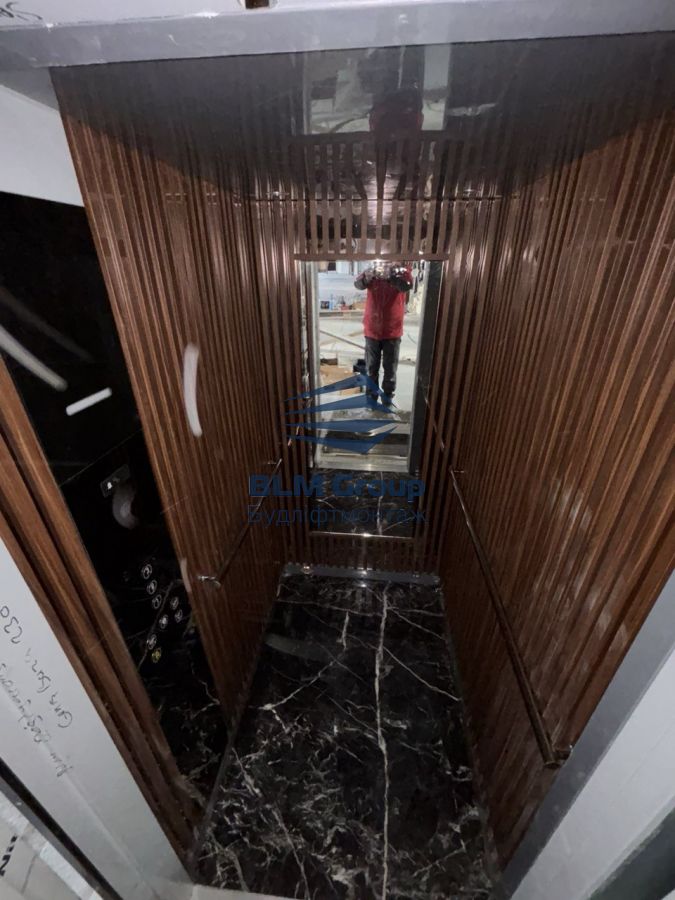 2023 рік. Місто Київ, вул. Дегтярівська. Виготовлення та поставка ліфта з індивідуальним дизайном замовника. Ліфт без машинного приміщення на 3 зупинки. Оздоблення кабіни: основа з нержавіючої сталі обшита дерев'яними елементами. Термін виготовлення ліфта 5 тижнів, монтажні роботи - 8 днів. Ліфти оснащенні системою аварійної евакуації, при вимкненні світла ліфт доїжджає до найближчого поверху та відчиняє двері.